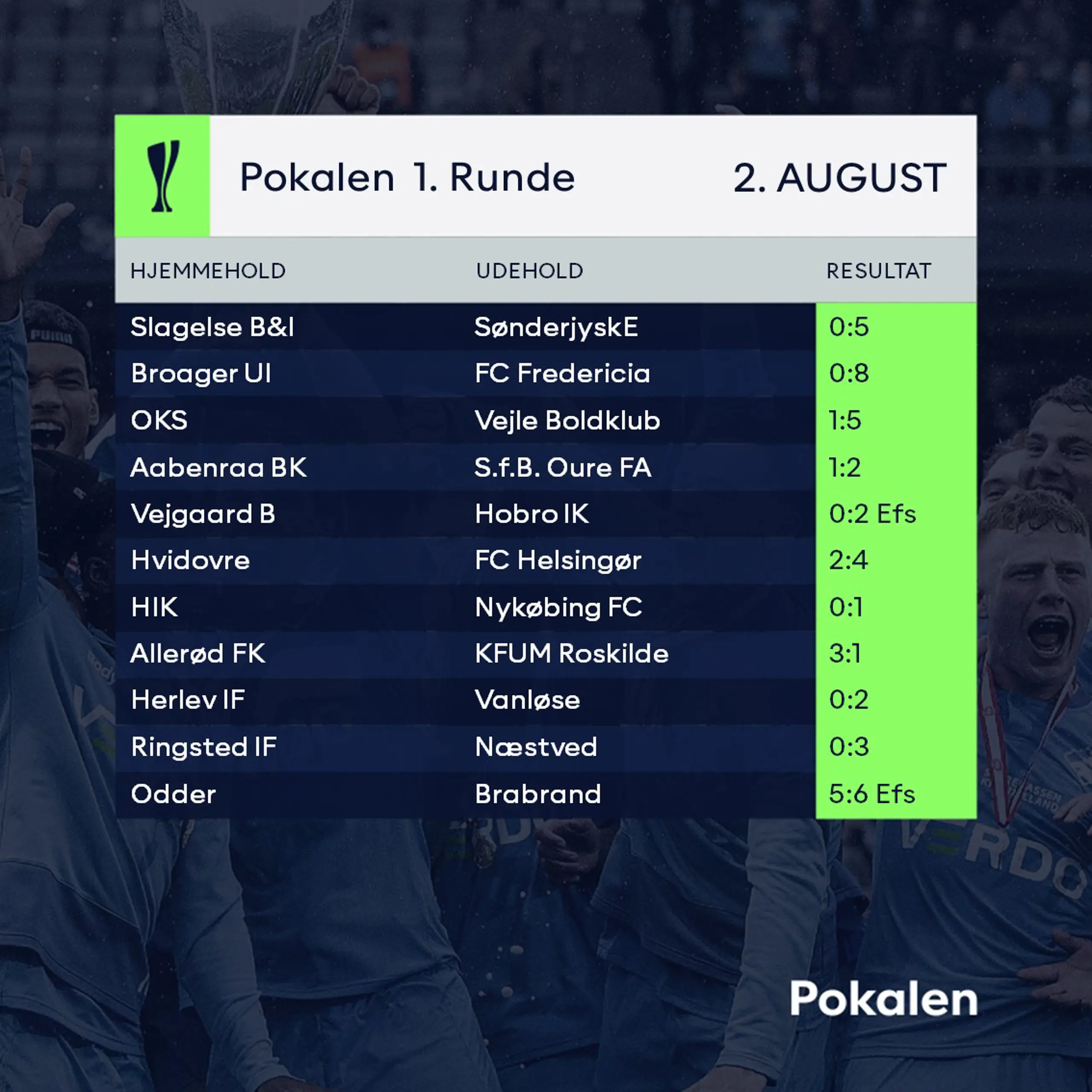 En stor pokalaften er ved at være slut, hele 29 kampe er der spillet i dag, og her er et lille udpluk af aftenens resultater, se alle resultaterne under fanen kommende kampe og resultater. Der lå et par overraskelser og lurede, da Vejgaard fra Danmarksserien pressede NordicBet Liga mandskabet fra Hobro ud i forlænget spilletid, som Hobro dog vandt med 2-0 og Odder ligeledes fra Danmarksserien pressede Brabrand fra 2. division helt ud i straffesparkskonkurrence, men også her trak favoritterne sig sejrrigt ud. I morgen onsdag er der 5 kampe på programmet – Drømmen Lever