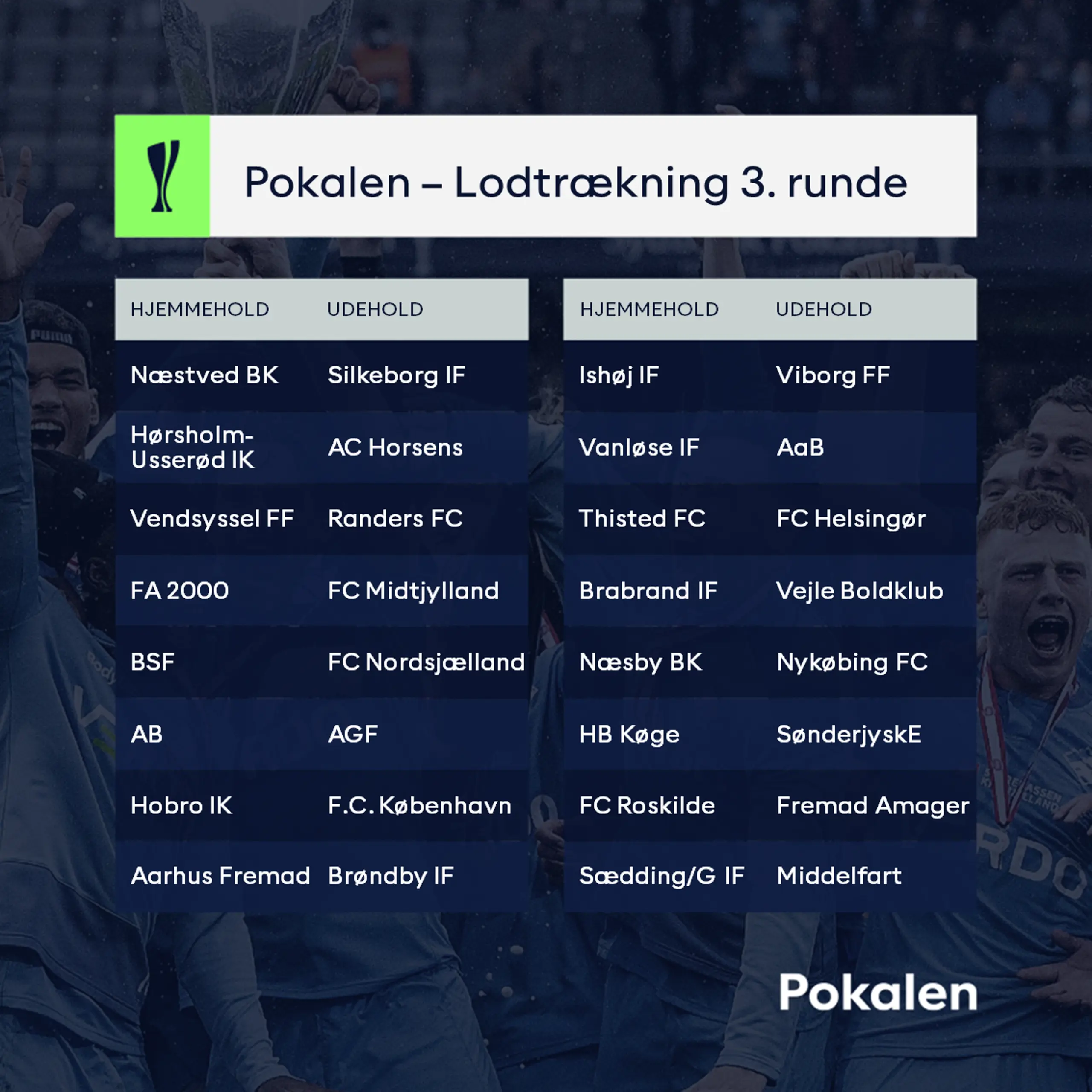 7. september 2022 Lodtrækning til 3. runde Der blev her til aften trukket lod til Pokalens 3. runde og det gav følgende kampe. 3. runde er programsat i dagene 18. til 20. oktober. 16. december 2024 Lodtrækningen til semifinalerne 31. oktober 2024 Lodtrækning til kvartfinalerne 26. september 2024 Lodtrækning til 4. runde 25. september 2024 Ny stor overraskelse i Oddset Pokalen 19. september 2024 AaB også klar til ottendedelsfinalerne