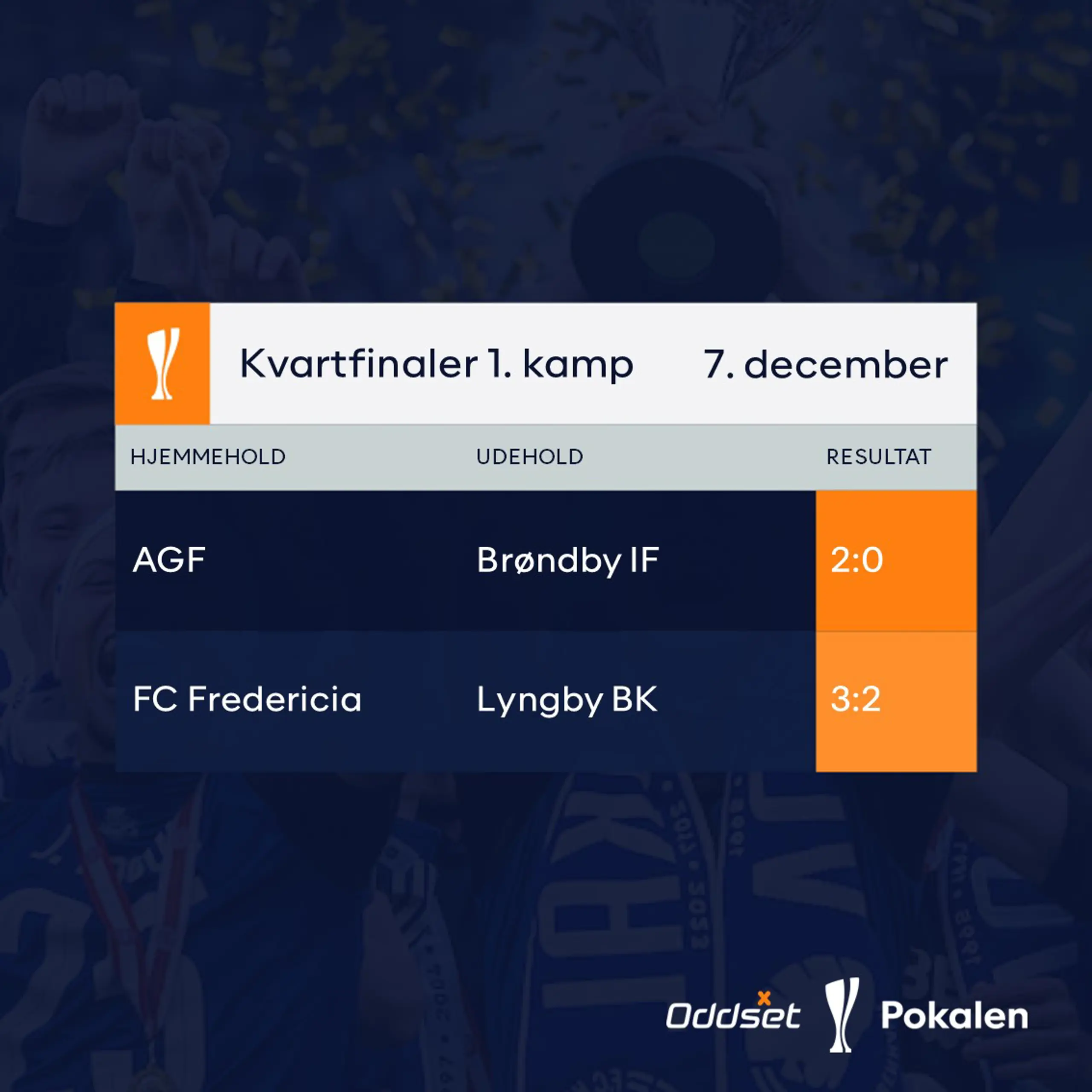 Aftenens to kvartfinaler er slut, og i Aarhus vandt AGF det første opgør med 2-0 mens FC Fredericia i en medrivende kamp slog Lyngby med 3-2 så der venter et par spændende returopgør på søndag – Drømmen Lever