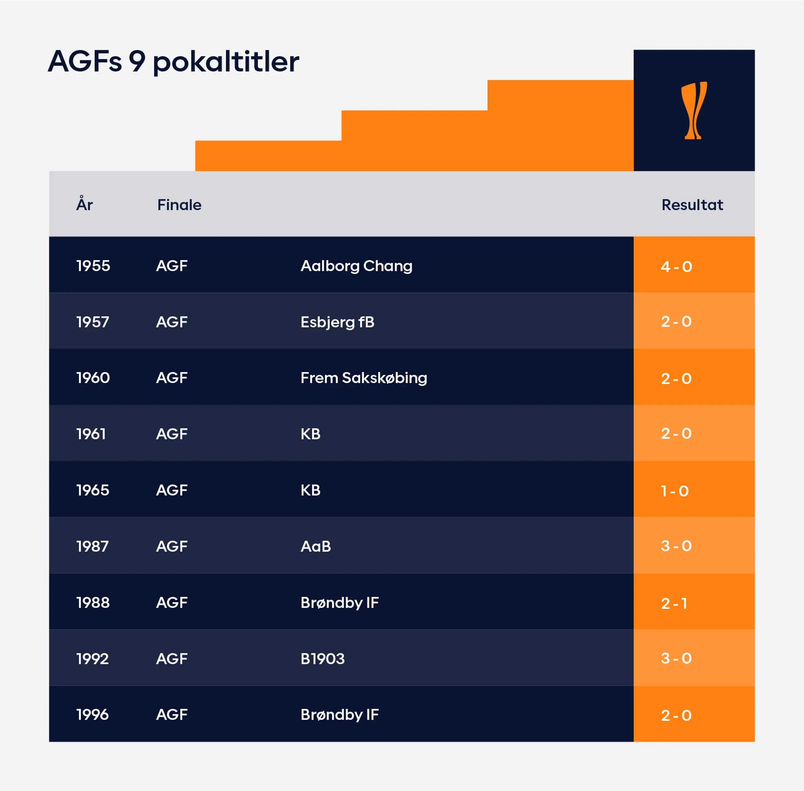 Ni gange har AGF vundet den danske pokalturnering. Det samme har F.C. København. AGF er på jagt efter tiende sejr, der kan bringe dem alene i front på rekordlisten.