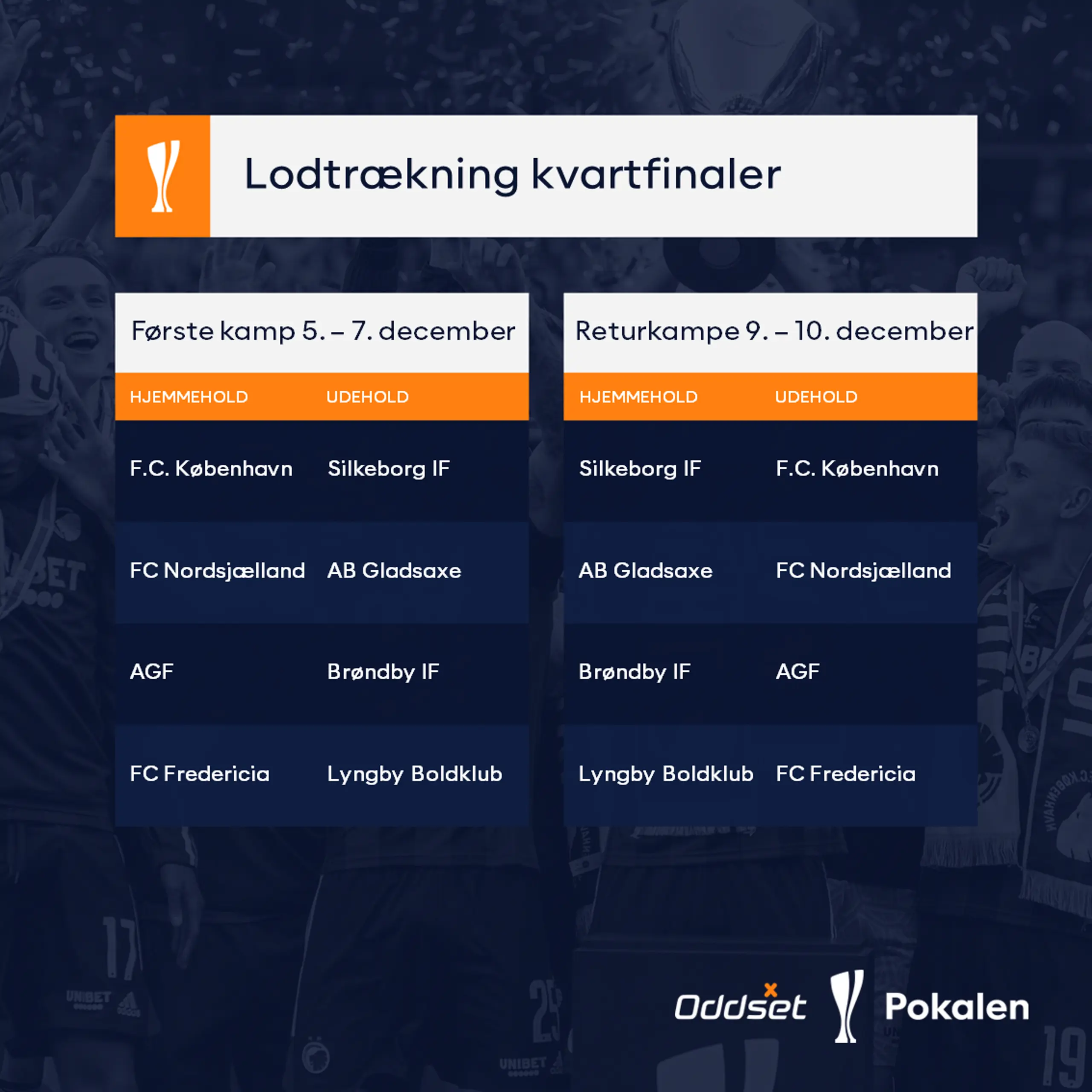 Der blev her til aften trukket lod til Oddset Pokalens kvartfinaler og det gav følgende kampe. Kvartfinalerne afvikles som dobbeltopgør, der er programsat i dagene 5.-7. december og 9.-10. december - Drømmen Lever.