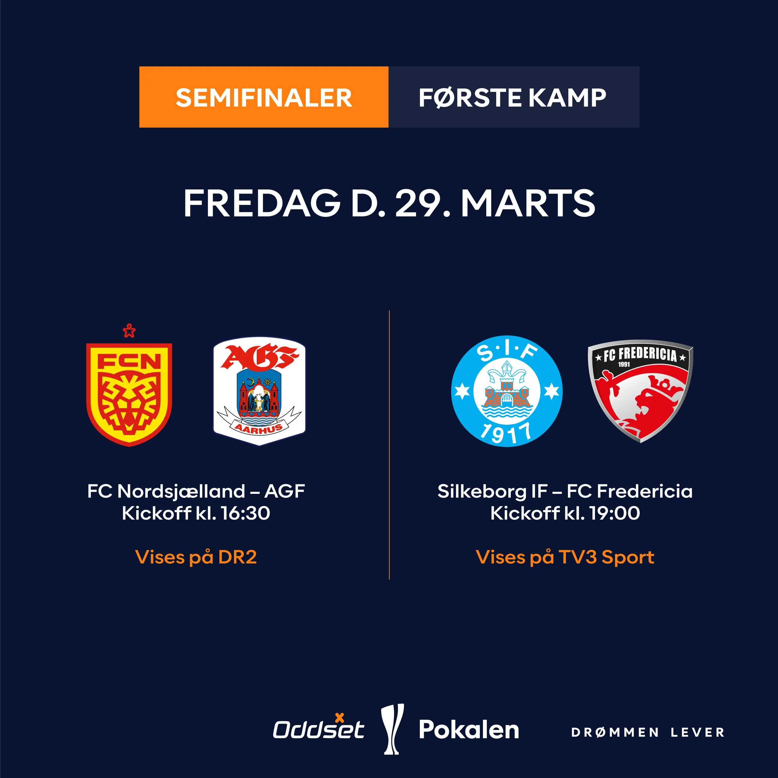 20. december 2023 Semifinaler 1. kamp Så kom der dato og TV-valg på den første af to semifinaler – Drømmen Lever 16. december 2024 Lodtrækningen til semifinalerne 31. oktober 2024 Lodtrækning til kvartfinalerne 26. september 2024 Lodtrækning til 4. runde 25. september 2024 Ny stor overraskelse i Oddset Pokalen 19. september 2024 AaB også klar til ottendedelsfinalerne