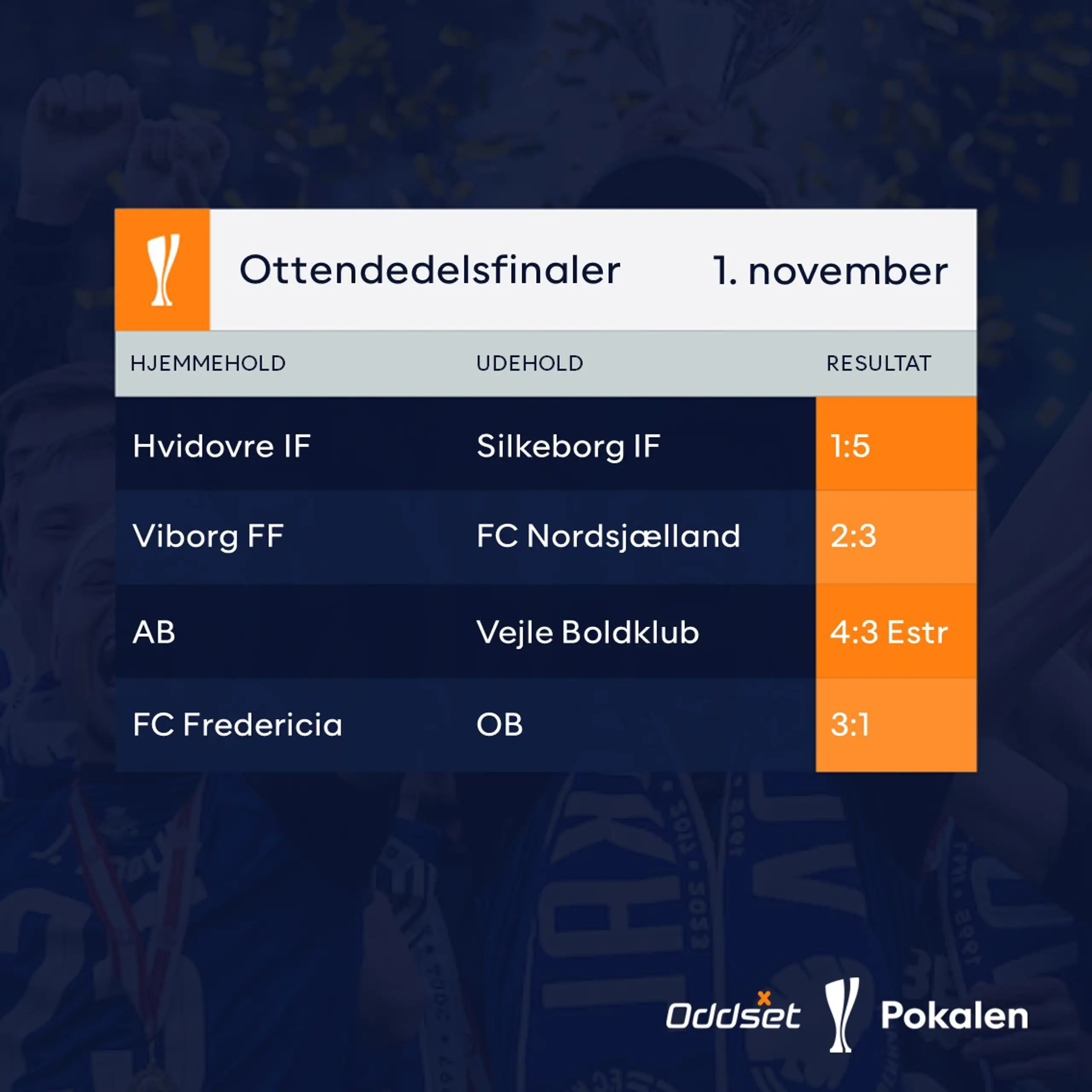 En vild pokalaften er slut og yderligere 4 klubber er klar til kvartfinalerne. AB og FC Fredericia stod for aftenens helt store overraskelser da de slog henholdsvis Vejle og OB ud af turneringen. AB efter et sandt pokaldrama der sluttede med straffesparkskonkurrence mens FC Fredericia slog OB hele 3-1 sejr! FC Nordsjællands Christian Rasmussen vil nok også særligt huske denne aften da han lavede hattrick i FC Nordsjællands sejr over Viborg FF. Der trækkes lod til kvartfinalerne i morgen torsdag umiddelbart efter kampen mellem Randers FC og Brøndby IF – Drømmen Lever